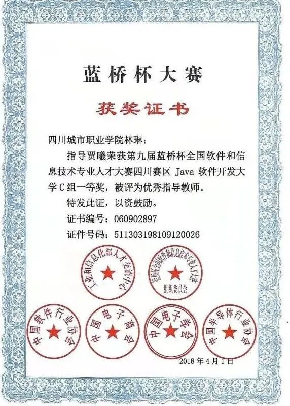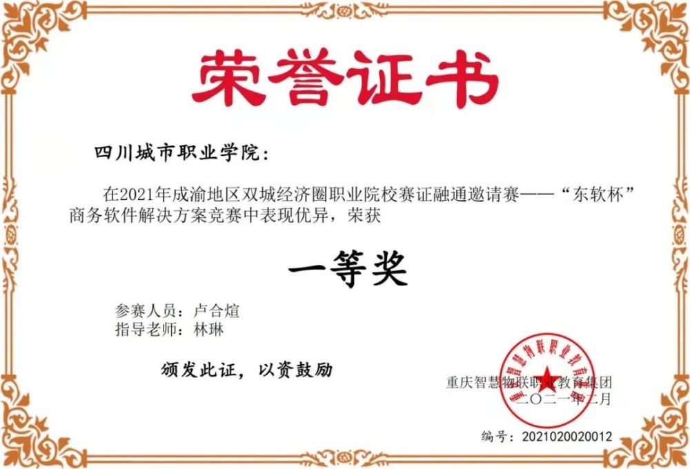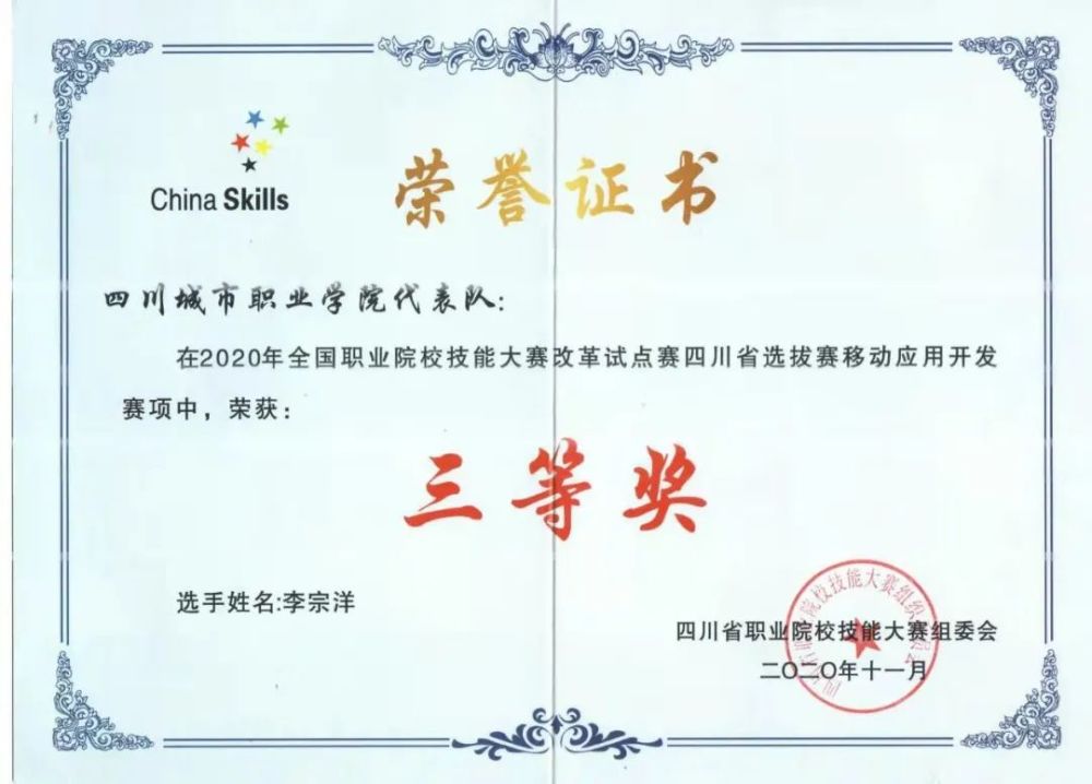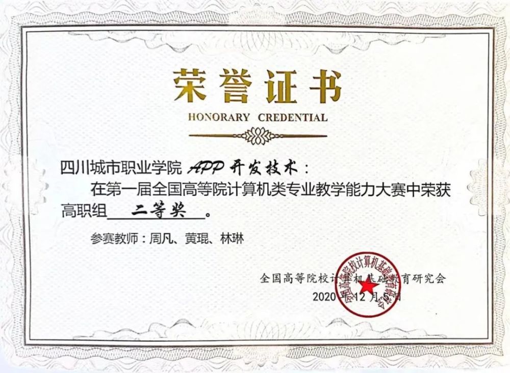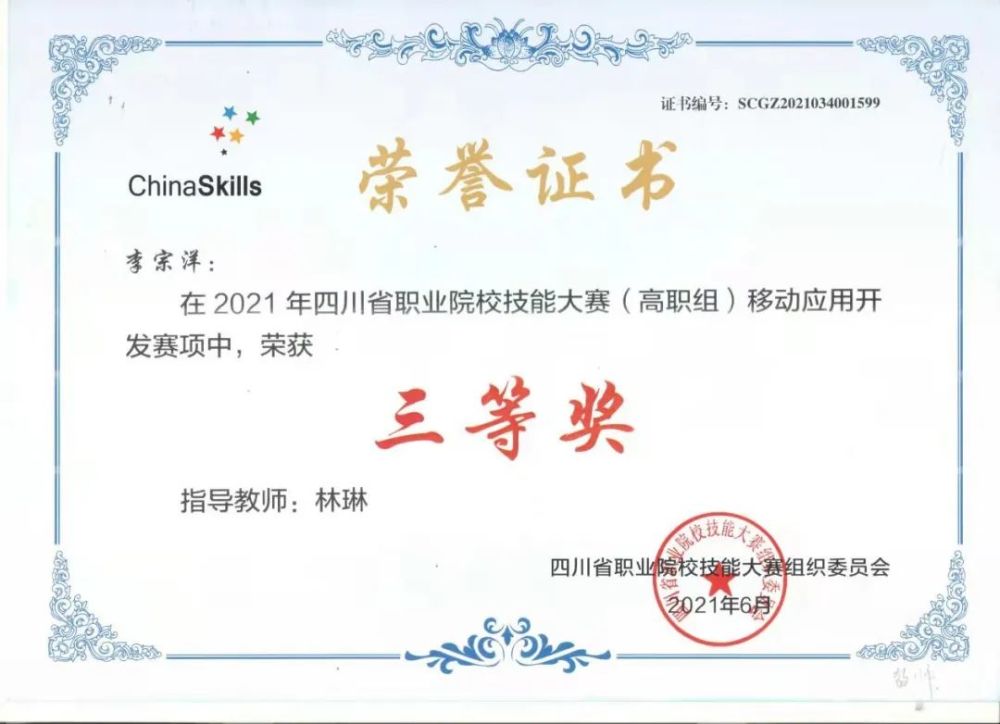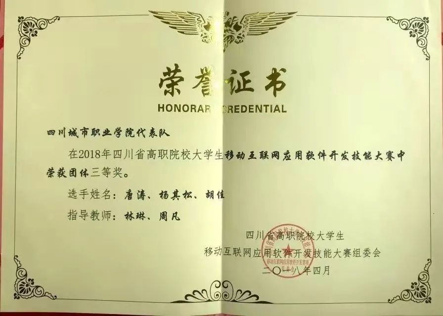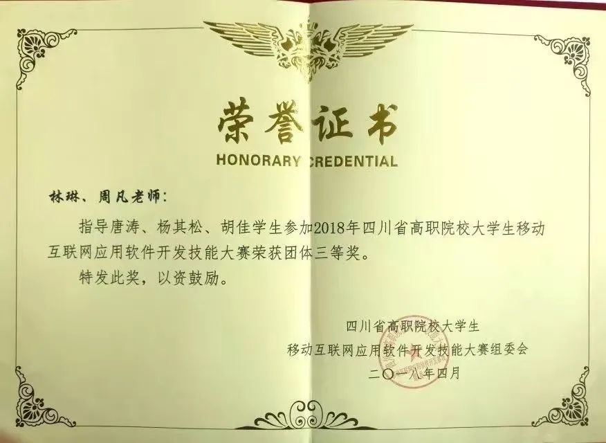 本专业学生在各类比赛中获奖达40余项:连续4年获得四川省高职院校大学生移动互联网应用软件开发技能大赛三等奖,多届蓝桥杯全国软件和信息技术专业人才大赛C语言、Java一二三等奖,四川省高职院校四合天地杯大数据与应用技能大赛三等奖,四川高职英语口语技能大赛一等奖,成渝地区商务软件解决方案大赛一等奖,三创赛(创新创业创意)省一等奖,首届中华职业教育创新创业大赛省二等奖等。