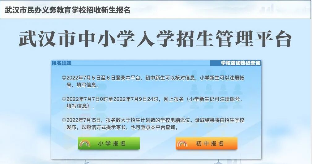 7月7日0时至7月9日24时登录本平台,网上报名。此时间段小学新生仍可先注册账号填写信息,再完成网上报名。