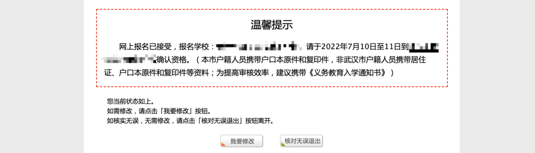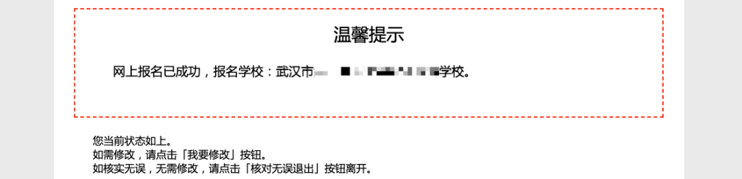 4.在上图报名状态页,再次核对报名状态。如需修改报名学校,点击我要修改按钮进行修改;如核对报名状态无误不修改,请点击核对无误退出按钮退出本次操作并注销登录。