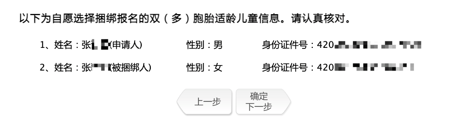 上一步所有需要捆绑的多胞胎学生都捆绑完毕后,点击捆绑人信息填写完毕。下一步,系统提示以下为自愿选择捆绑报名的双(多)胞胎学生信息。请认真核对。