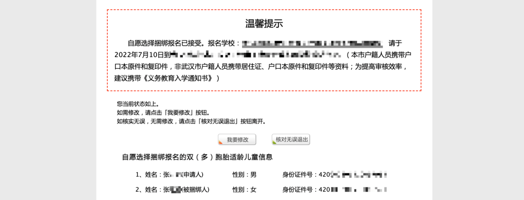 注意:点击我要修改按钮,将解除所有多(双)胞胎的捆绑关系,并清除所有捆绑多(双)胞胎的报名意愿。多(双)胞胎学生解除捆绑后可各自进行报名,也可根据上述步骤重新捆绑报名。