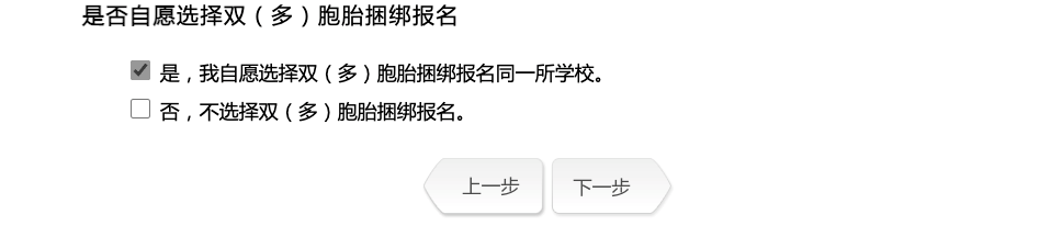 点击我要报名按钮,在是否双(多)胞胎选项中勾选是或否,然后点击下一步,勾选是将进入双(多)胞胎捆绑报名,勾选否将返回普通报名。