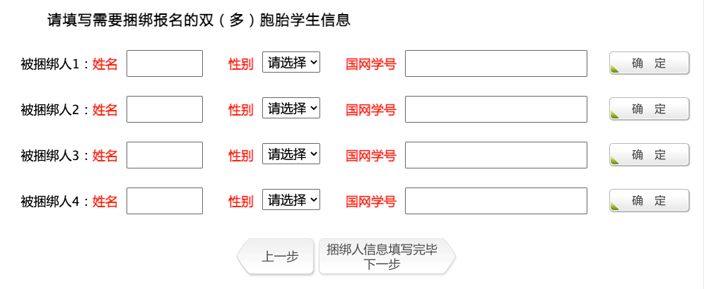 上一步骤勾选是,点击下一步后,请按系统提示填写需要捆绑报名的双(多)胞胎学生信息,只需要填写被捆绑人的姓名、性别、身份证件号(小学)或国网学号(初中),点击确定按钮,完成双胞胎捆绑。如果是多胞胎,继续填写下一个被捆绑学生信息,并点击确定按钮,直至所有需要捆绑的多胞胎学生都捆绑完成。若信息填写有误,系统将提示无法完成捆绑。