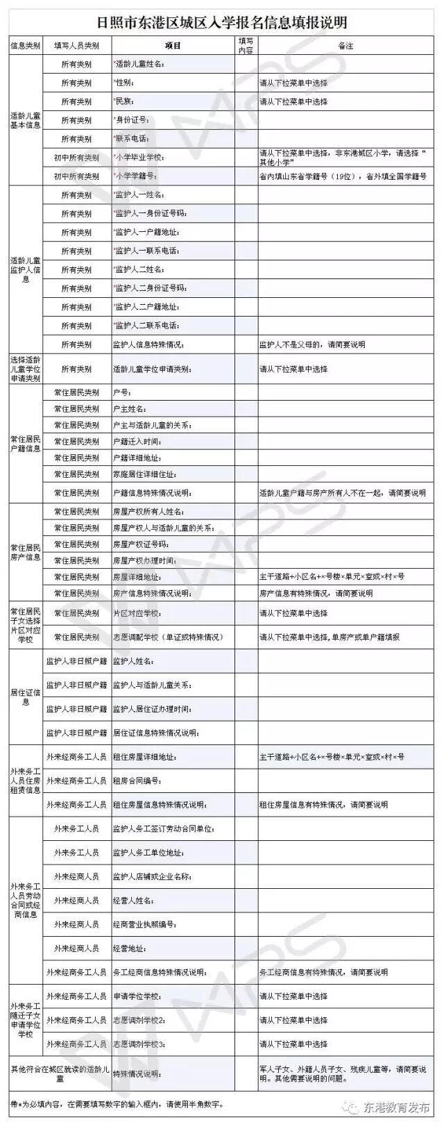 3.填报信息分为适龄儿童和监护人的基本信息,城区常住居民户籍和房产信息,外来务工人员租住房屋信息、务工或经商信息,非日照户籍需采集监护人之一的居住证信息。并不是所有项目信息都需填报,请根据所具备的条件选择相应类别,填报与之相关的信息即可。请认真阅读《城区义务教育学校报名系统填写说明》,如果你所拥有的户籍、房产、务工等信息有特殊情况,请在信息特殊情况说明中作简要解释。
