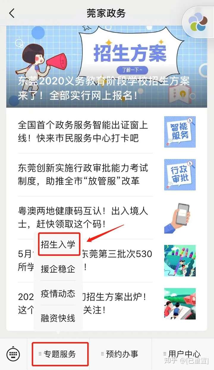 (2)关注莞家政务微信公众号,点击专题服务栏目,进入招生平台。