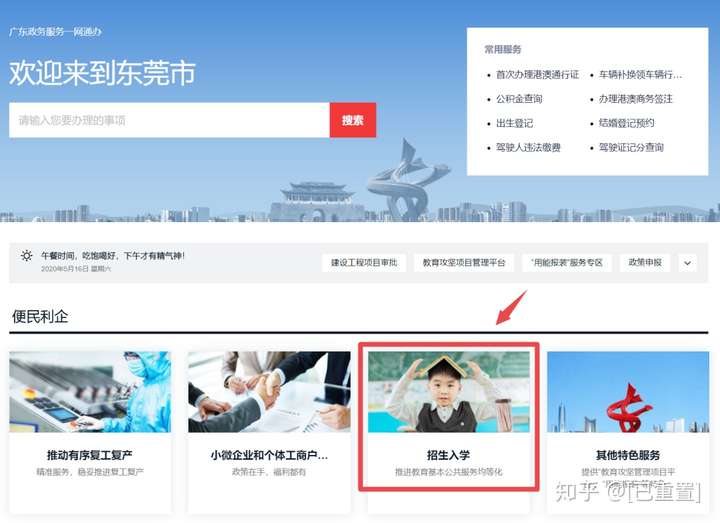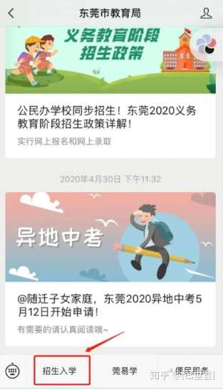 (3)登录东莞市教育局微信公众号,点击招生入学栏目,进入招生平台。