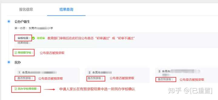 11录取结果查询1.申请人家长可以在结果查询栏目查询审核结果以及预录取结果(即是否被预录取);2.民办学校预录取结果公布后,家长选择其中一所进行民办学校预录取确认。