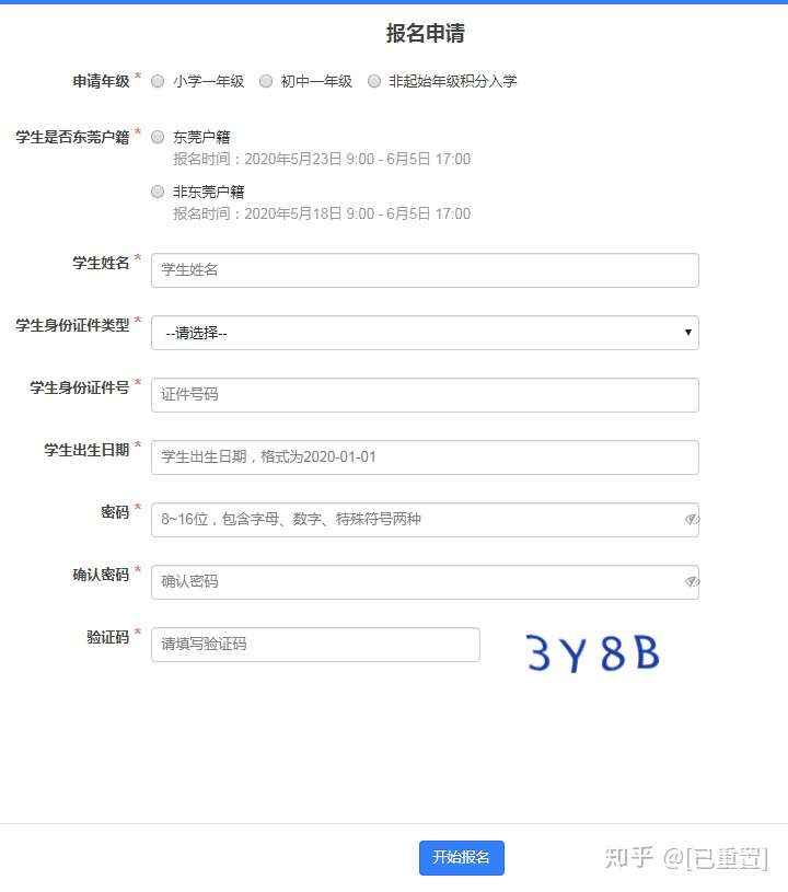 根据招生平台栏目要求填写学生的户籍、申请年级、证件号码,设置密码;填写完成后,点击开始报名;