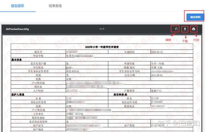 4.申请人家长修改信息后可以通过右上角的功能键刷新,重新显示修改后的信息;也可以通过下载打印功能下载和打印申请表。