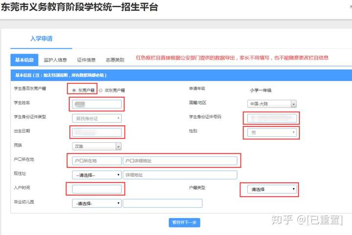 东莞户籍的学生户籍信息由系统根据公安部门提供数据直接导出,家长补充填写现住址、毕业学校/幼儿园等信息,如显示的户籍信息与实际不相符的,请带上学生户口本到户籍地教育部门进行核实修改。