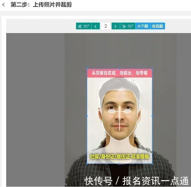 点击下一步,从手机相册中选择照片并上传。请务必严格按照下图所示模板进行裁剪,注意头部距离顶部的留白距离,以及脸部大小占比。