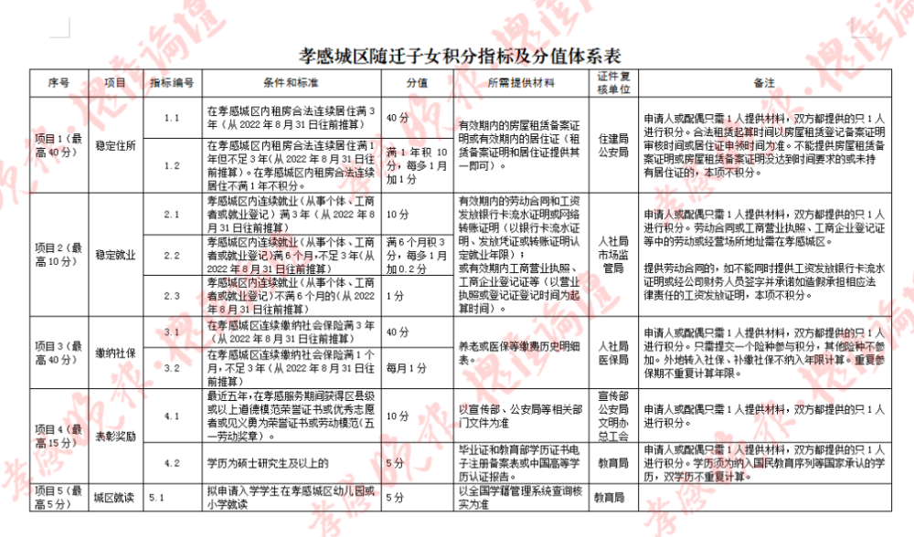 孝感城区随迁子女积分指标及分值体系表