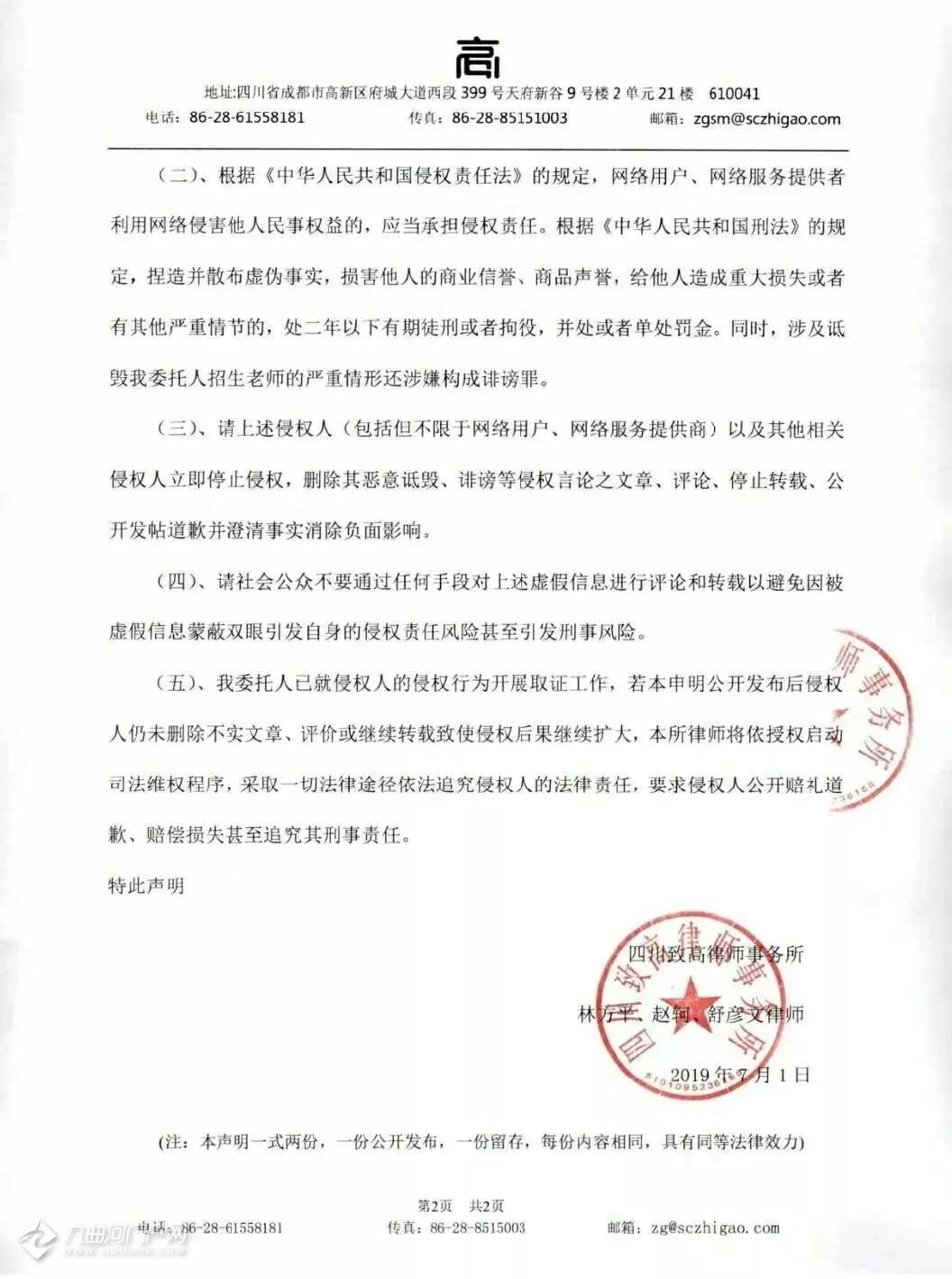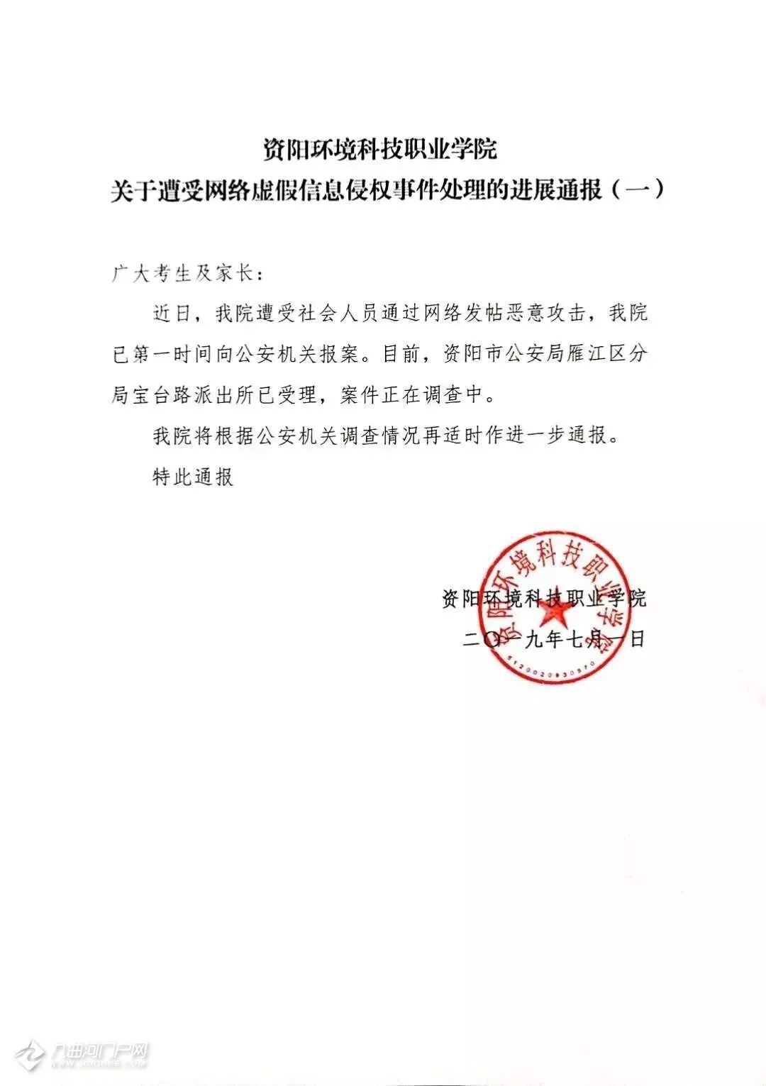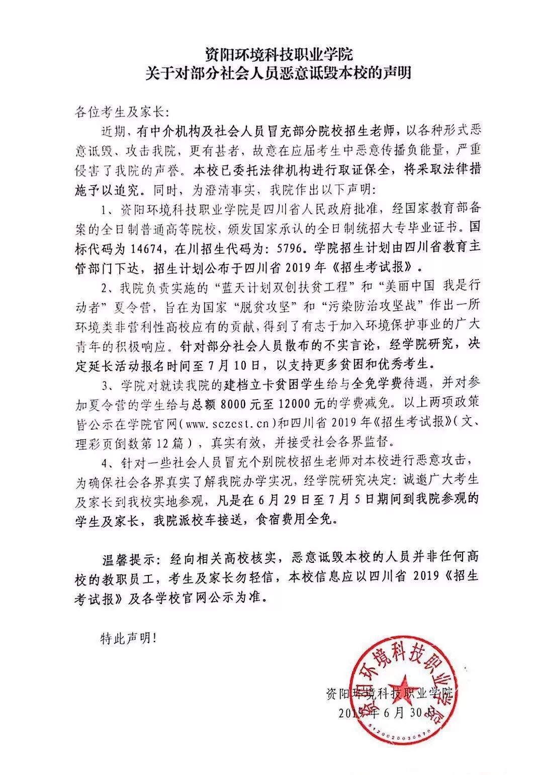 7月1日,资阳环境科技职业学校再次发表关于社会人员通过网络媒体公开恶意诋毁学校的声明。