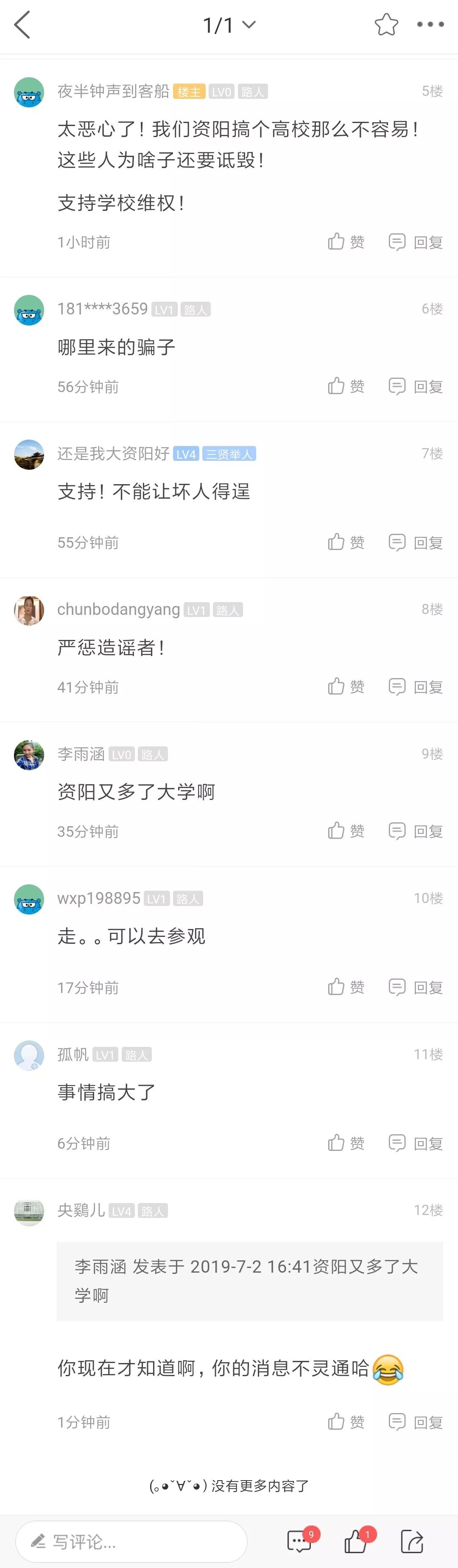 今天河友@夜半钟声到客船也在河马app分享了资阳环境科技职业学校的辟谣声明,同时表示:太恶心了!我们资阳搞个高校那么不容易,这些人为啥子还要诋毁?支持学校维权!