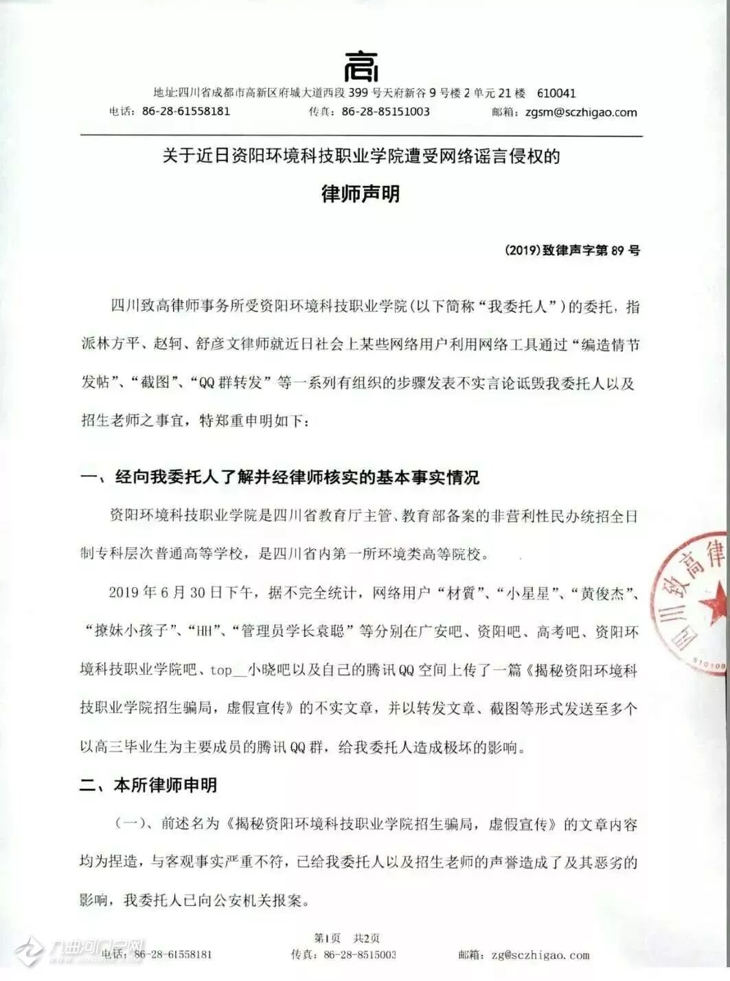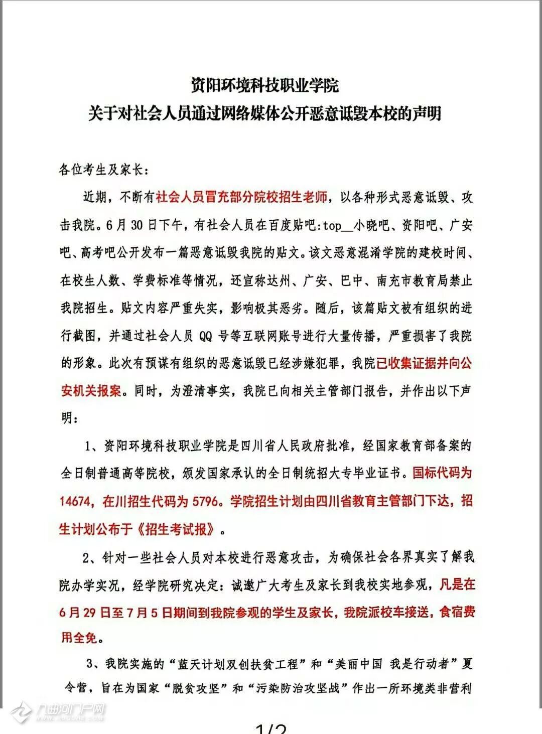 最近,资阳环境科技职业学校招生存在虚假宣传的消息在网上流传,并引发四川多地高考考生关注。