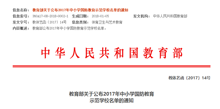《中小学国防教育示范学校名单》