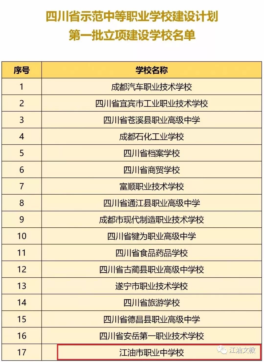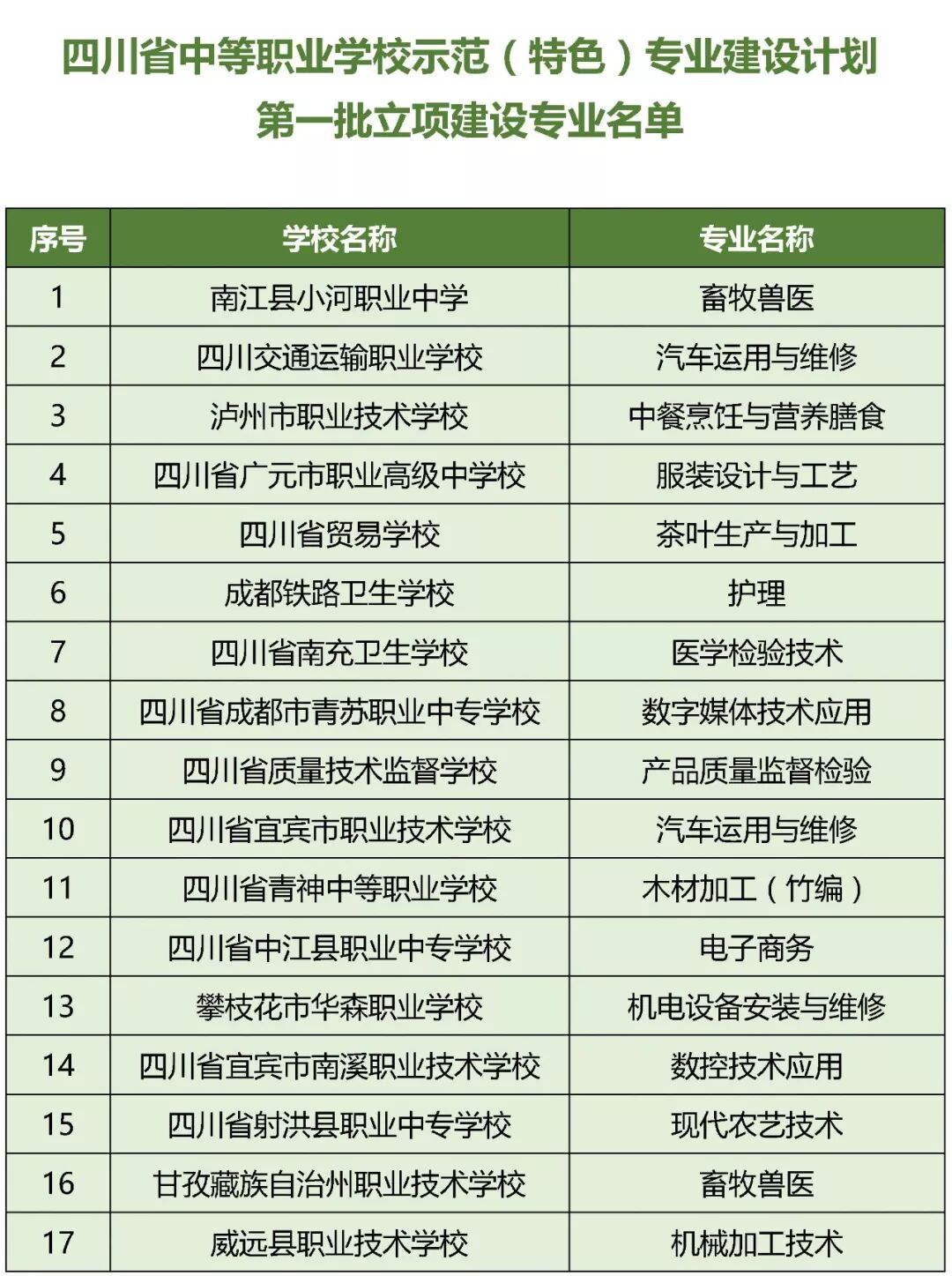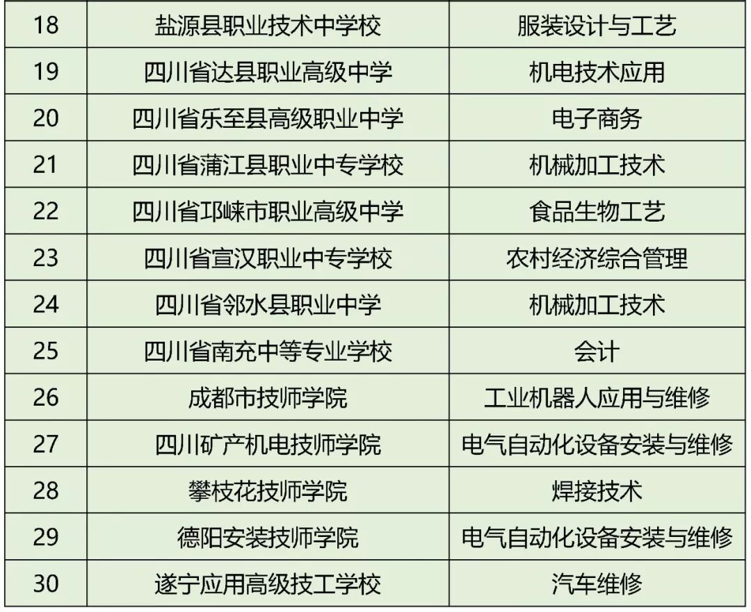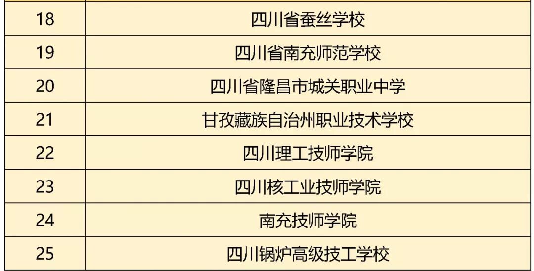 近日,四川省教育厅、四川省人力资源和社会保障厅、四川省财政厅联合下文公布了四川省示范中等职业学校第一批立项建设学校名单25所、四川省中等职业学校示范(特色)专业第一批立项建设专业名单30个,快来看看有没有你熟悉的学校。