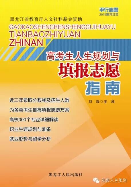 省内最专业的高考填报志愿指导书籍2015年新版《高考生人生规划与填报志愿指南》,刘毅教授主编,哈市、牡丹江市、佳木斯市、齐齐哈尔市、七台河市等顶尖重点高中校长参编,哈三中、师大附中扬子江书店,哈六中香安书店,淘宝店有售