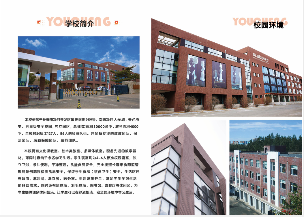 优成学校坐落于长春市净月开发区擎天树街959号。南临净月大学城,景色秀美。五星级安全校园,独立园区,总建筑面积30000余平,教学面积4000平,全校教职员工127人,86人的师资队伍。并配备专业的政教团队、保洁团队、后勤保障团队、厨师团队。