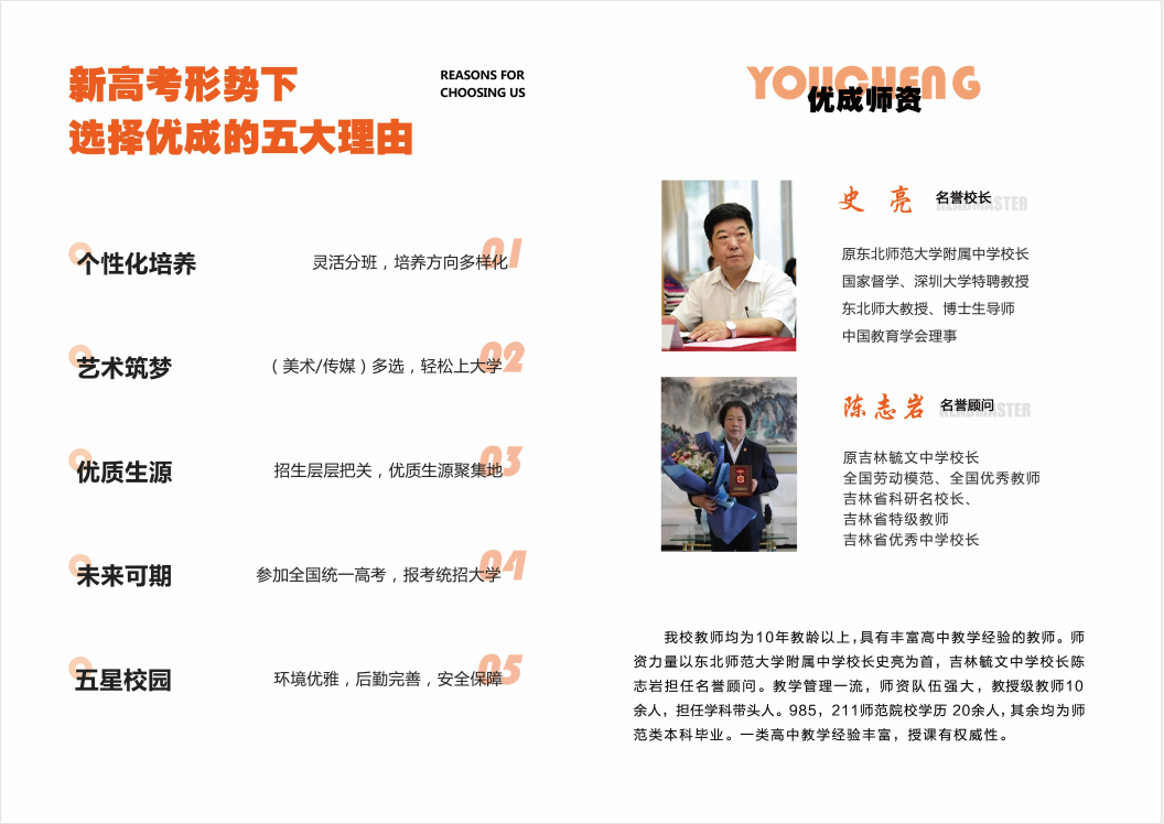 优成学校教师均为10年教龄以上,具有丰富高中教学经验的教师。师资力量以东北师范大学附属中学校长史亮为首,吉林毓文中学校长陈志岩担任名誉顾问。教学管理一流,师资队伍强大,教授级教师10余人,担任学科带头人。985、211师范院校学历20余人,其余均为师范类本科毕业。一类高中教学经验丰富,授课有权威性。
