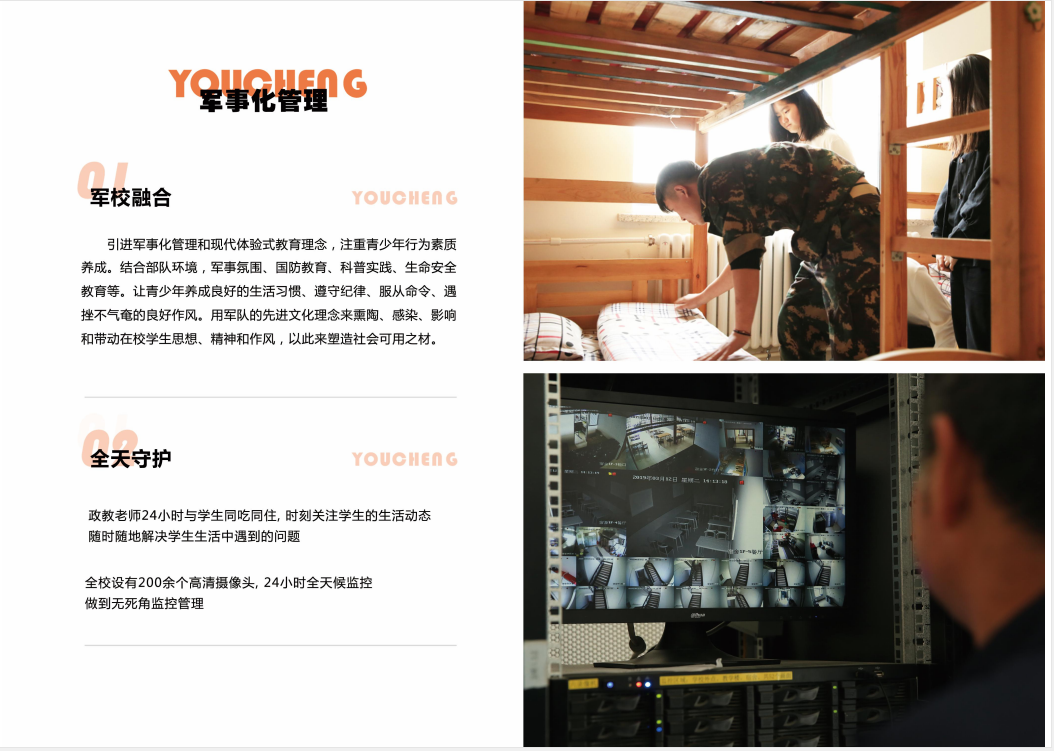 引进军事化管理和现代体验式教育理念,注重青少年行为素质养成。结合部队环境,军事氛围、国防教育、科普实践、生命安全教育等,让青少年养成良好的生活习惯、遵守纪律、服从命令、遇挫不气奄的良好作风。用军队的先进文化理念来熏陶、感染、影响和带动在校学生思想、精神和作风,以此来塑造社会可用之材。