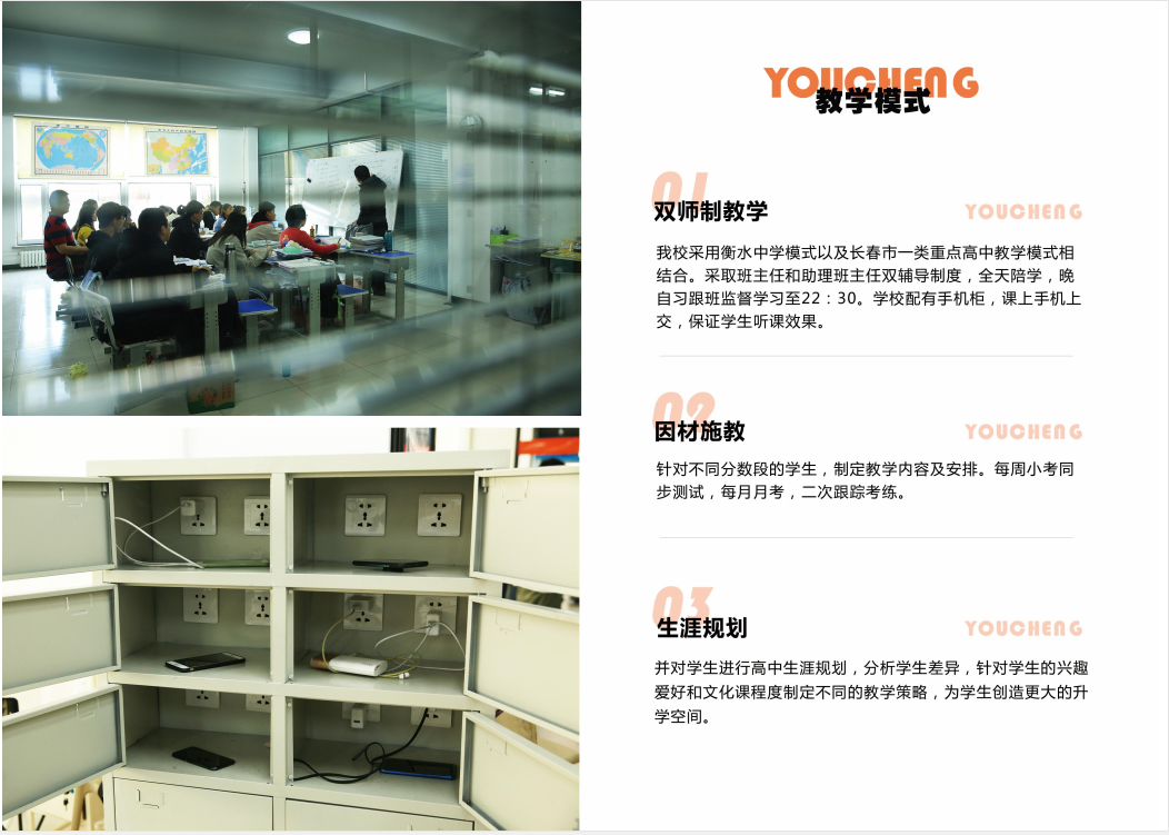优成学校采用衡水中学模式以及长春市一类重点高中教学模式相结合。采取班主任和助理班主任双辅导制度,全天陪学,晚自习跟班监督学习至22:30学校配有手机柜,课上手机上交,保证学生听课效果。