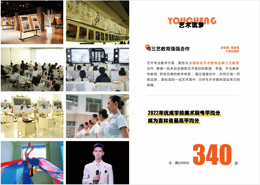 优成学校拥有文化课教室、艺术类教室、多媒体教室。配备先进的教学器材,可同时容纳千余名学习生活。学生寝室均为4-6人标准校园寝室,独立卫浴,条件便利,干净整洁。食堂食品安全,完全按照长春市食药监管理局条例流程检测食品安全,保证学生食品(饮食卫生)安全。生活区还有超市、淋浴间、洗衣房、医务室。生活设施齐全,满足学生学习生活的各项需求。同时还有篮球场、羽毛球场、图书馆、咖啡厅等休闲区,为学生提供课余休闲娱乐。让学生可以在舒适整洁、安全的环境中学习生活。