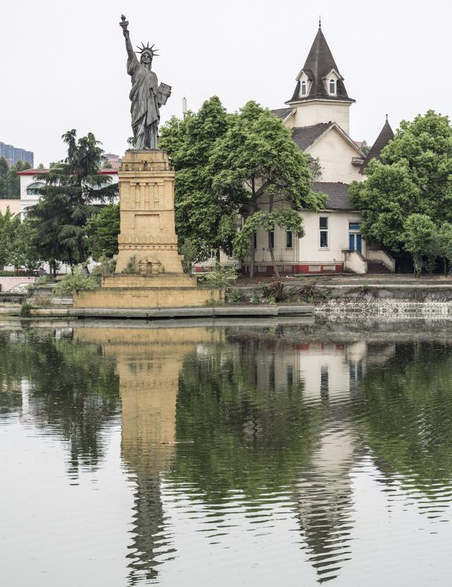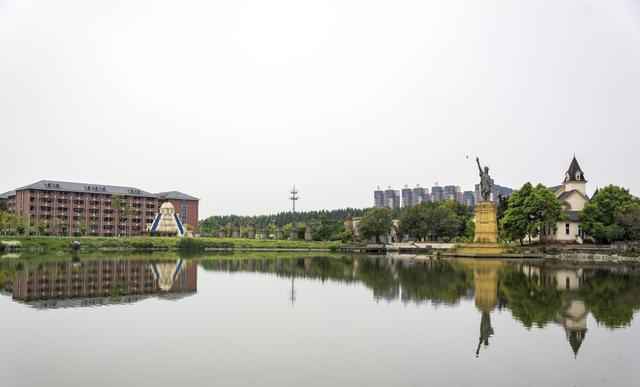 校园的中心是一片巨大的水域,两旁也有很多欧式建筑倒映在水中,特别好看,让人称奇的是竟然还有自由女神像,不愧是被称为小世界之窗的地方,果然是哪儿的地标建筑都给复制一份过来,有点深圳的风采。