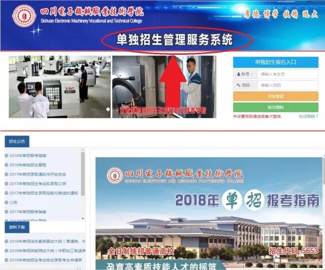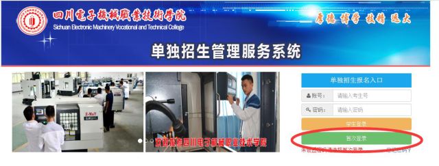 考生登录:已通过四川省教育考试院报名的考生,登录我院单独招生管理服务系统(http://dz.scemvtc.mcitedu.cn/),首次登录需要通过验证(考生号、姓名、身份证号),验证通过后修改个人登录密码(请牢记密码)。