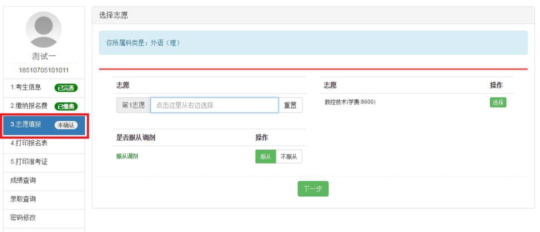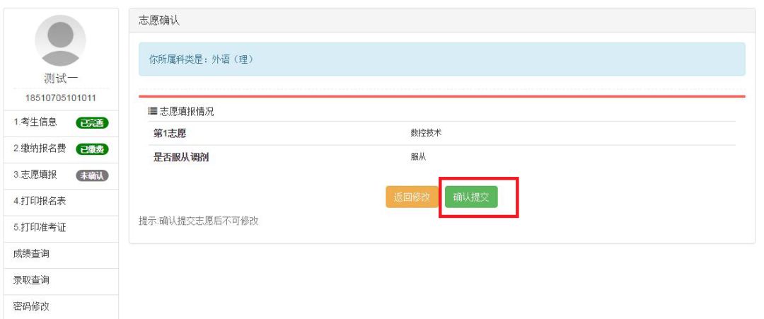 志愿填报:各位考生请点击志愿填报,选择志愿专业后点击下一步,可查看个人将要提交的志愿专业,也可返回修改志愿专业。确定无误后点击确认提交,确认提交后志愿不可再修改,同时志愿填报显示为已确认。