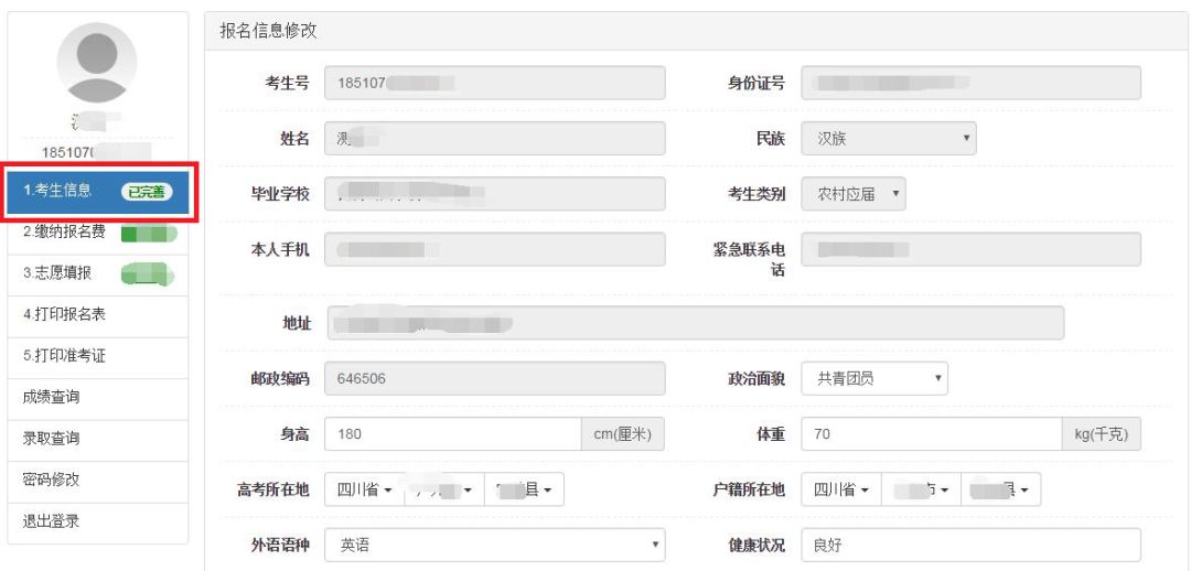 考生信息:各位考生查看个人报名信息,确认无误后请填写个人其他信息,完善个人信息后点击保存修改,修改好后考生信息显示已完善。