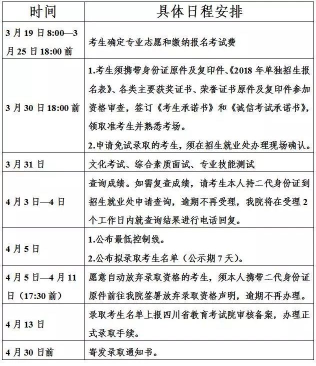 3.所有符合免试录取条件的考生均须在我院单招报名截止前向学校提交《四川省2018年高职院校单独招生免试录取考生申请表》。