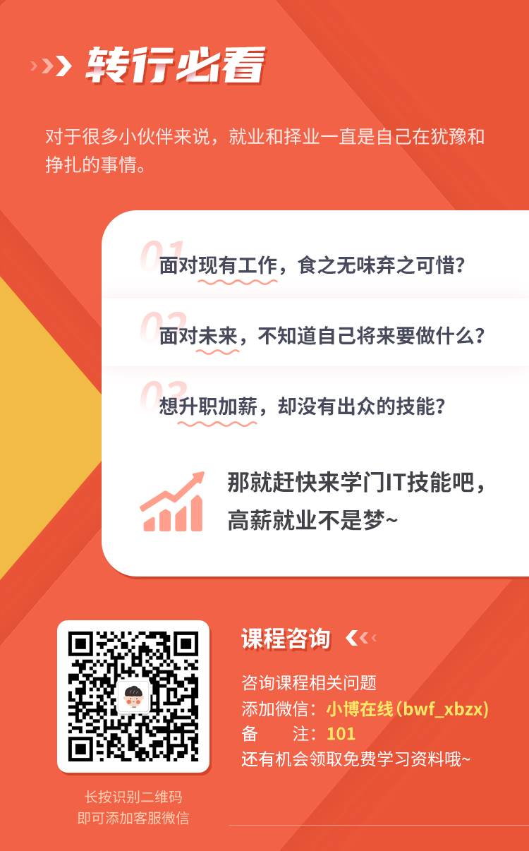 总的来说,开发是一个发展空间大,越老越吃香的行业,对于想要转行的同学而言,心态是十分重要的,有了转行的念头,就需要保持良好的心态,朝着目标努力实施,只要坚持,就没什么达不到的。