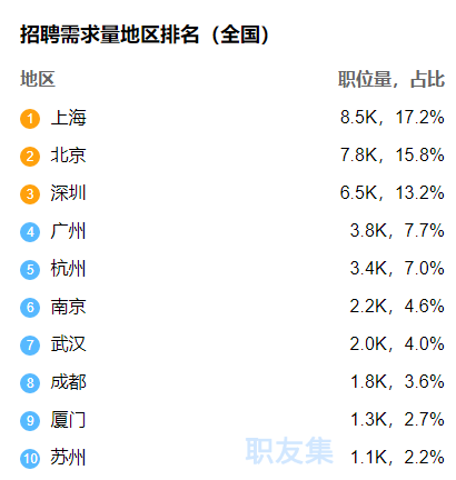 其中,招聘的高频地区还是处于北上广深,但杭州苏州等一线城市,近几年的需求量也在不断增长中。