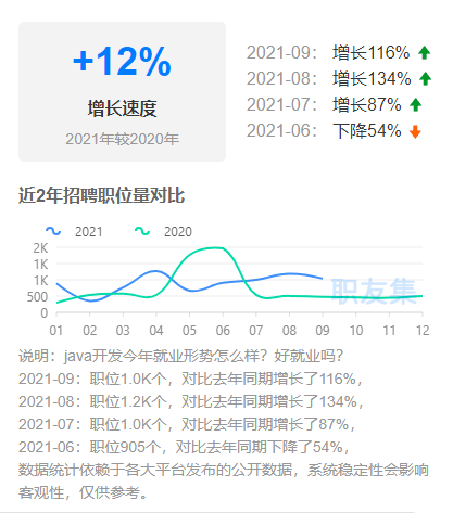 从数据中我们可以看出,2021年相较于2020年平均增长速度为12%,以9月举例,招聘岗位同去年相比增长了116%。