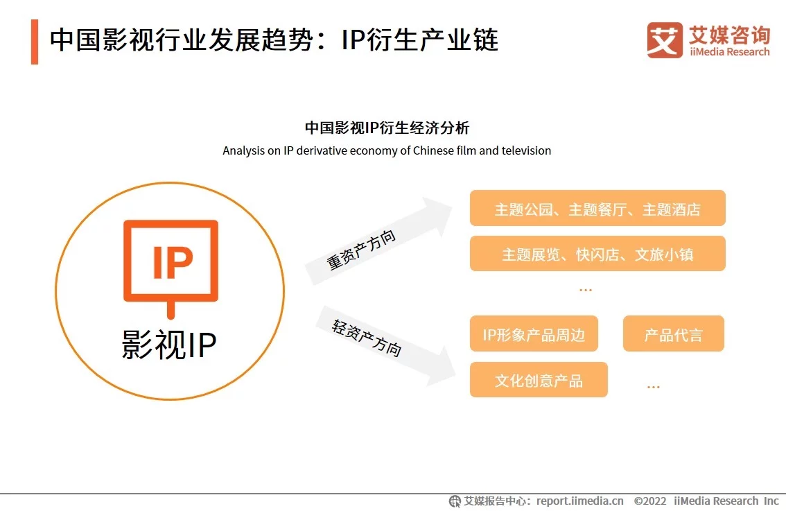 相比于国外,中国影视IP产业链尚未充分发展,未来影视行业的企业将借助影视IP,发展周边产品、广告代言、主体展会、主题乐园、文旅小镇等影视IP衍生产品,影视IP产业链将趋于成熟。