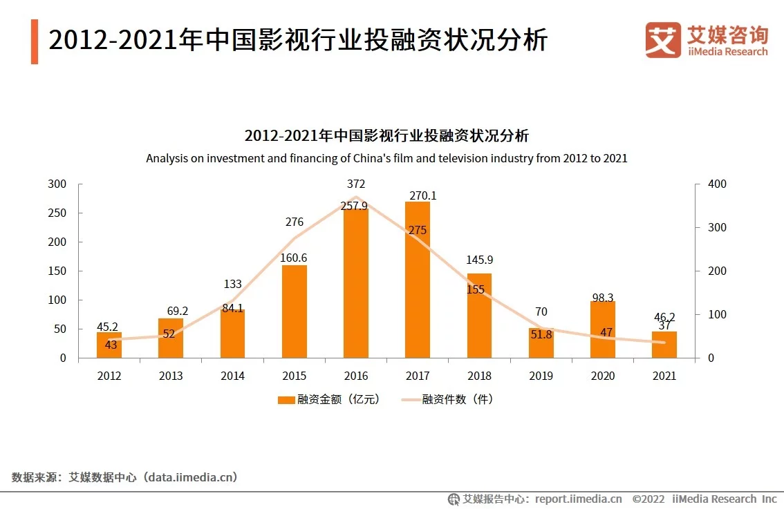 数据显示,中国影视行业投融资金额在2017年达到顶峰,为270.1亿元,随后融资金额与融资数量总体呈下滑趋势。