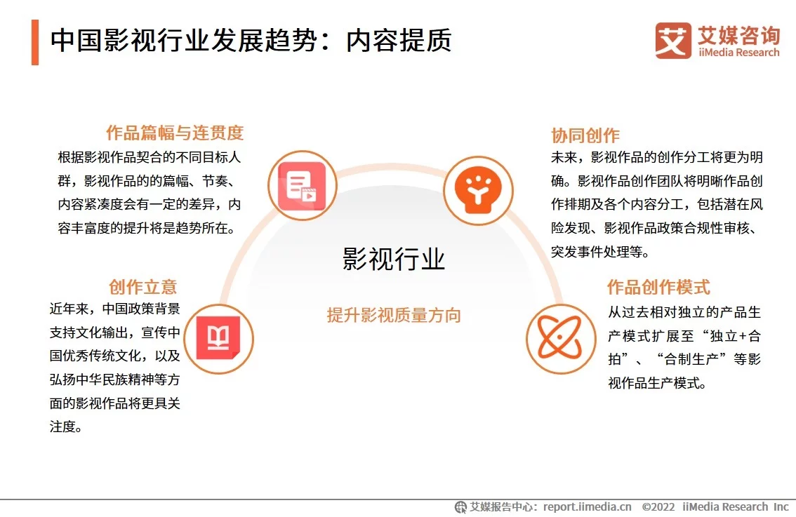 在中国政策注重内容端输出的背景下,影视行业创作者们将从创作立意、作品创作模式、作品篇幅、连贯性与协同创作等方面提升影视产品的质量,内容提质是行业的发展方向。