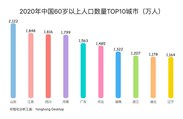 你知道我国哪些城市拥有数量最多的60岁以上人口吗?由国家统计局相关数据,2020年我国内地有30个省市存在一定程度的老龄化问题,其中,辽宁省、上海市、黑龙江省等60岁以上人口占比超过23%,老龄化问题明显。根据人数计算,山东成为2020年中国60岁以上人口数量最多的城市,其60岁老人的数量高达2122万人,比有些省份的人口总数还多。同时,2020年中国60岁以上人口数量较多的城市还有江苏、四川、河南等,其数量均在1800万人左右。