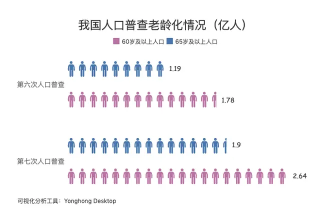 同时,值得关注的是我国目前的老龄化情况。在第六次人口普查中,我国有1.78亿60岁及以上的老人,还有1.19亿65岁及以上的人口。而到了第七次人口普查,这两数据均出现上涨,60岁及以上的老人达到2.64亿,占总人口的18.7%,65岁及以上的老人有1.9亿人,占总人口的13.5%。相较于第六次人口普查,60岁及以上人口的比重上升5.44个百分点,65岁及以上人口的比重上升4.63个百分点。从中可见,我国人口老龄化问题日益严峻。据相关预测,按如此速度发展,2023年我国60岁及以上人口的的比率将会达到20%,在这样的背景下,就会产生所谓的人口红利,也就是说,庞大的老年群体,势必会带来老年相关市场的高速发展。