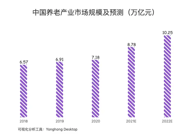 我国养老产业市场近年来呈现出蓬勃发展态势,归根到底是由于中国老龄化程度不断加重。2018、2019年这两年,我国养老产业市场规模还不足7万亿元,而到了2020年,养老产业市场规模突破7万亿元,达到7.18万亿。据预测,2021年和2022年,中国养老产业市场规模将分别达到8.78万亿、10.25万亿。