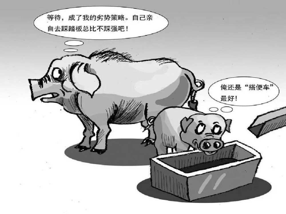 这就意味着,率先去拉杆的猪吃亏,而守在食槽里坐享其成的猪更占便宜。