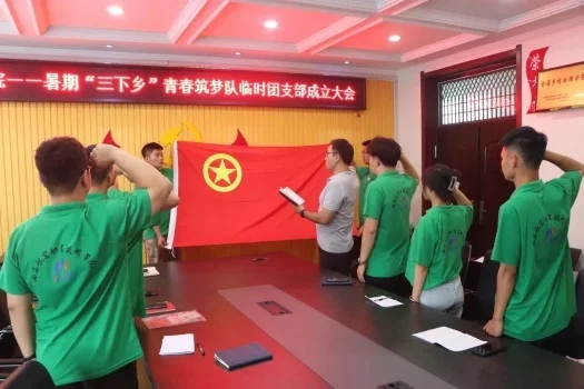 下午18:00,在庄严肃穆的国歌声中,志愿者们召开了西航职院——暑期三下乡青春筑梦队临时团支部成立大会,会议由段腾同学主持,大会通过无记名投票方式,选举产生侯晓东同志担任临时团支部书记,段腾同学任组织委员,李鹏帆同学任宣传委员。并由侯老师带领13位队员重温入团誓词,庄严的宣誓一字一句都代表了大家对于圆满完成本次活动的信心。