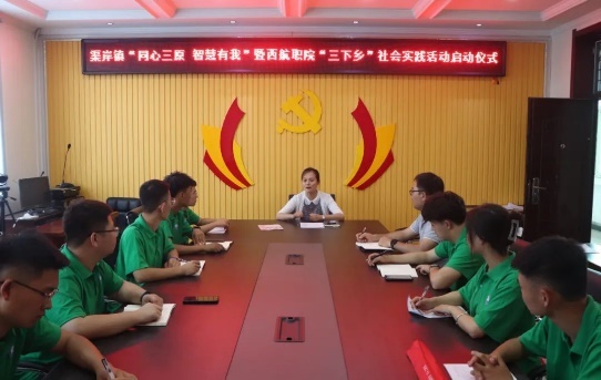 全体队员在会议室举行了渠岸镇‘同心三原,智慧有我’暨西航职院‘三下乡’社会实践活动启动仪式。会议伊始,侯晓东老师向渠岸镇党委副书记张晓敏介绍了本次三下乡团队的成员构成及活动目的,并阐述了志愿者们围绕乡村振兴战略所做的前期准备。