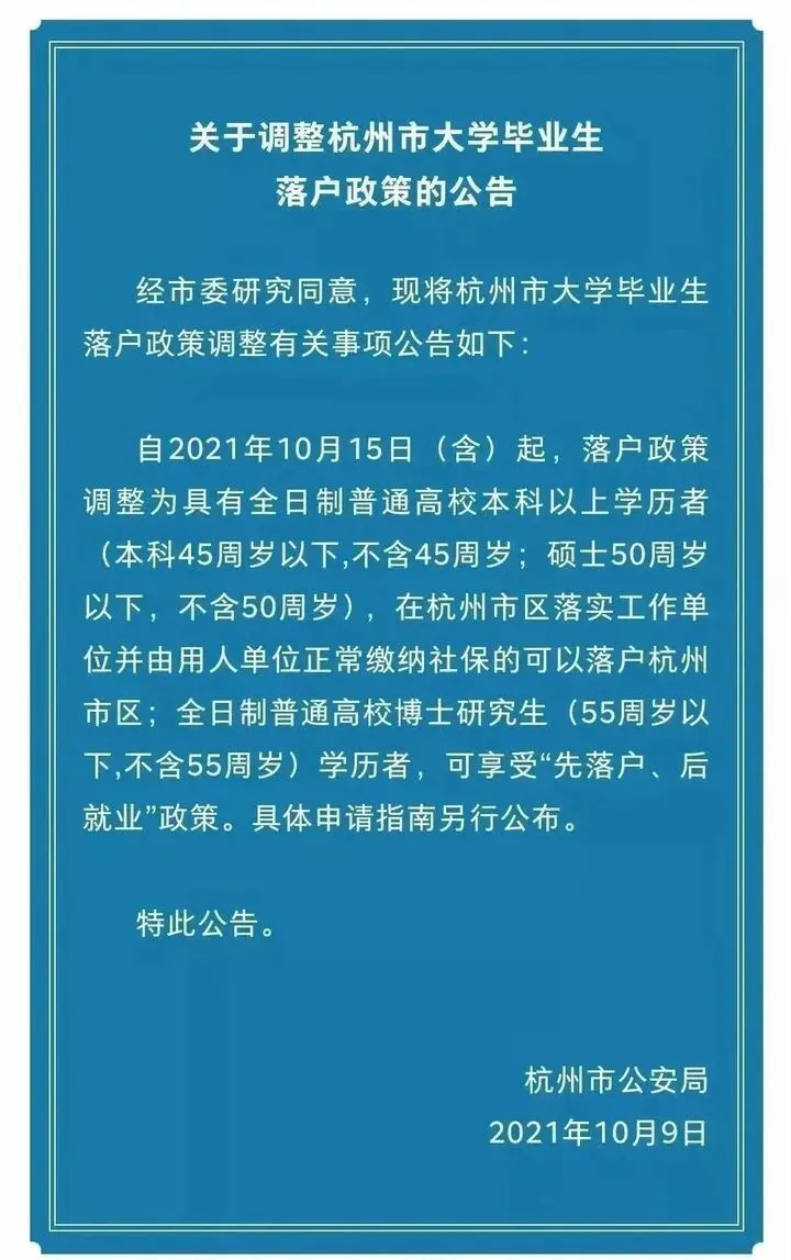 此前,杭州最近的一次落户政策调整要追溯到去年10月份,当时暂停了全日制专业学历落户和硕士研究生先落户、后就业政策。