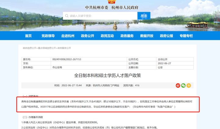 乐居买房讯乐居获悉,杭州市人民政府门户网站日前发布《全日制本科和硕士学历人才落户政策 》,对全日制本科和硕士学历人才落户政策进行了一些调整: