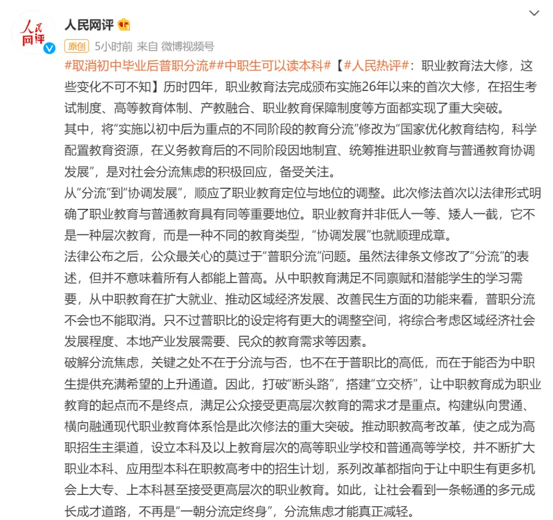 4月25日,@人民网评发表评论称:破解分流焦虑,关键之处不在于分流与否,也不在于普职比的高低,而在于能否为中职生提供充满希望的上升通道。因此,打破断头路,搭建立交桥,让中职教育成为职业教育的起点而不是终点,满足公众接受更高层次教育的需求才是重点。构建纵向贯通、横向融通现代职业教育体系恰是此次修法的重大突破。推动职教高考改革,使之成为高职招生主渠道,设立本科及以上教育层次的高等职业学校和普通高等学校,并不断扩大职业本科、应用型本科在职教高考中的招生计划,系列改革都指向于让中职生有更多机会上专业、上本科甚至接受更高层次的职业教育。如此,让社会看到一条畅通的多元成长成才道路,不再是一朝分流定终身,分流焦虑才能真正减轻。