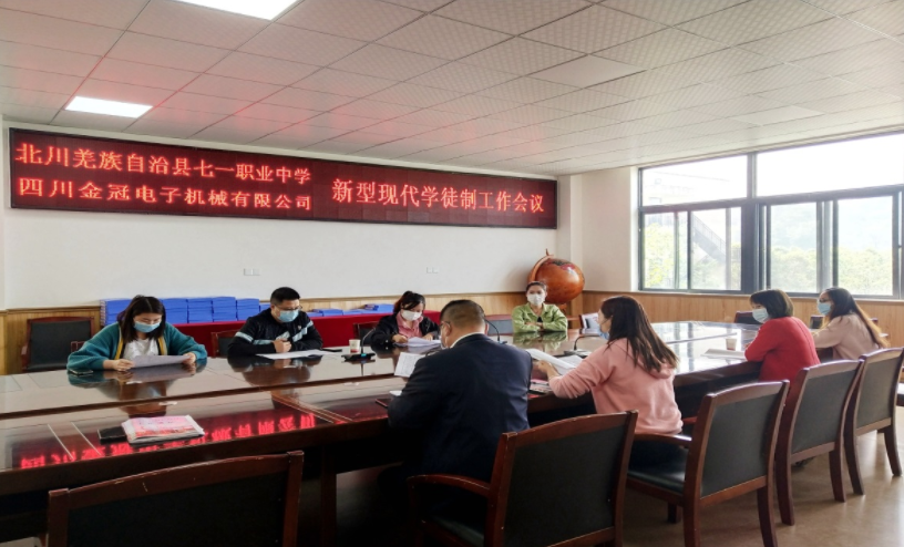 为推动产教深度融合,推进学校专业特色发展,全面培养企业新型学徒,助力当地企业综合实力的提升,从而服务当地经济的向好发展。2020年4月14日,北川羌族自治县七一职业中学——四川金冠电子机械有限公司企业新型学徒制工作会议在北川七一职业中学党员活动室举行。本次会议校企双方修订了企业新型学徒制人才培养方案,确定了详细的课程计划表。并且双方商定北川七一职中专业老师到企业挂职,负责企业新型学徒的管理和教学,企业董事长担任学校教学指导委员会成员,指导专业建设。