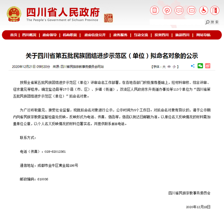 据四川省人民政府网12月21日消息,按照全省第五批民族团结进步示范区(单位)评审命名工作部署,在各地各部门积极推荐基础上,经材料审核、综合评审、征求意见等程序,我省确定盐边县等27个县(市、区)、乡镇(街道),双流区人民政府东升街道办事处等113个单位为四川省第五批民族团结进步示范区(单位)拟命名对象。