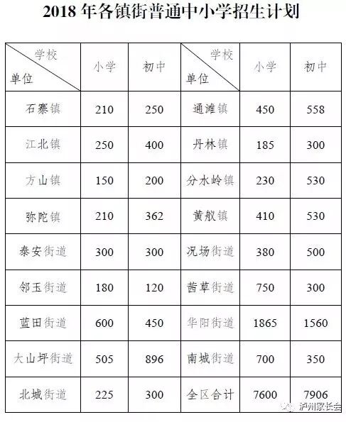2018年,江阳区计划小学招收7600人,初中招收7906人,区属普高(实验中学)招收750人,区属职高(江阳职高)招收2200人。
